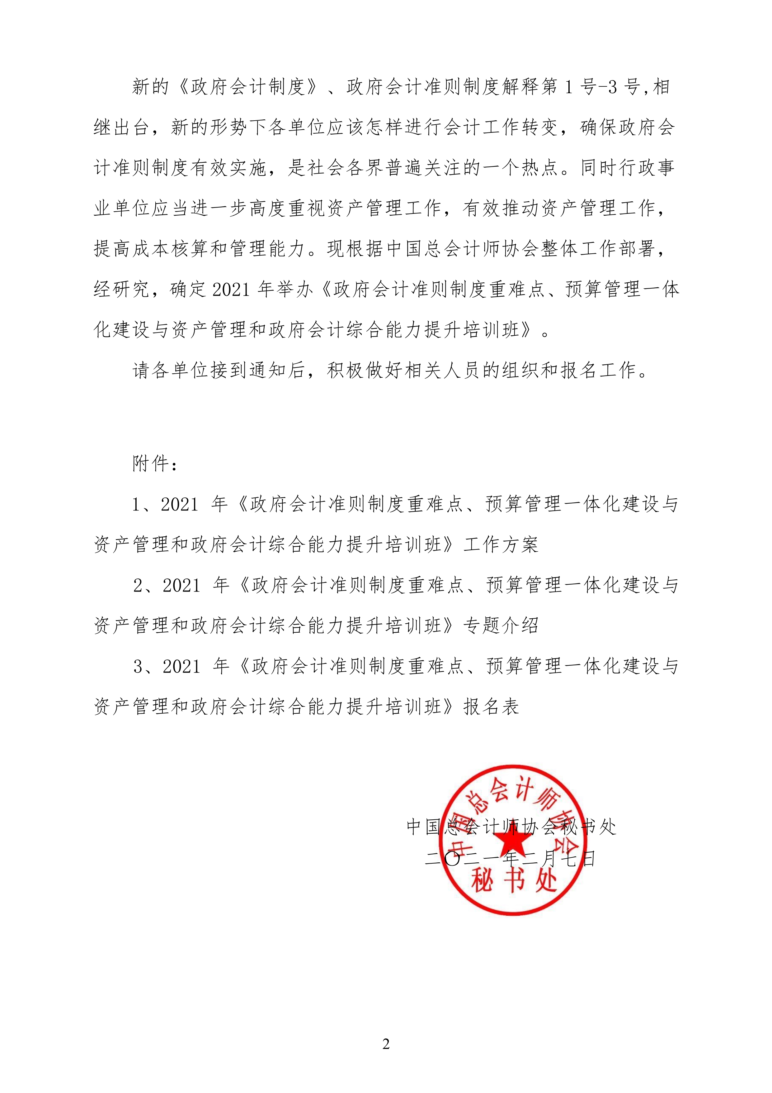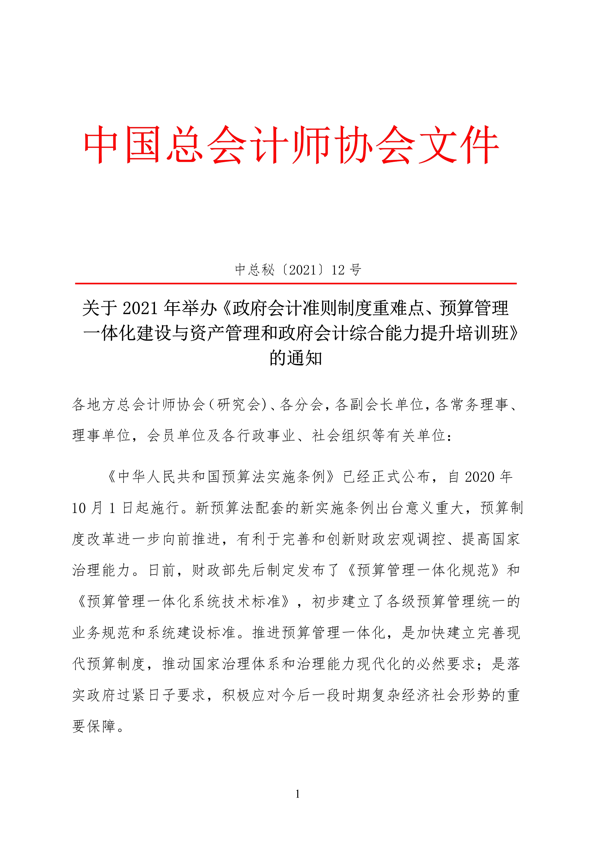 附件:中總秘[2021] 12號 關(guān)于2021年舉辦《政府會計準則制度重難點、預算管理一體化建設(shè)與資產(chǎn)管理和政府會計綜合能力提升培訓班》的通知/upload/edit/file/20210220/20210220163521_64580.pdf